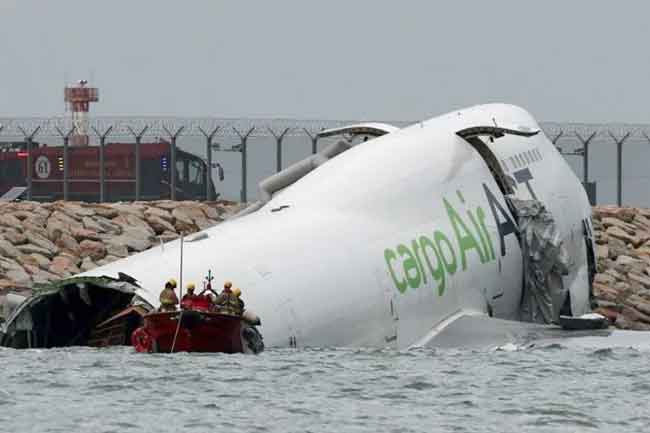 හොංකොං හී භාණ්ඩ ප්රවාහන ගුවන් යානයක් ධාවන පථයෙන් ඉවතට පැන මුහුදට වැටෙයි